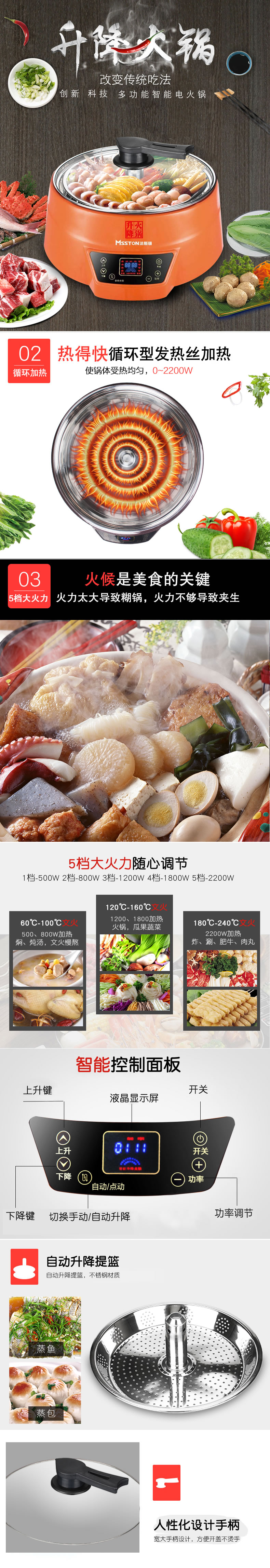 * 独特升降功能,自动升降提篮,不锈钢材质; * 双层防烫一体锅,隔热保温; * 一锅百变多用,涮、蒸、煮、焖、炸 * 智能控制面板,5档大火力随心调节; * 分体组合设计,可拆分沥水盘,更易于餐后清洗;